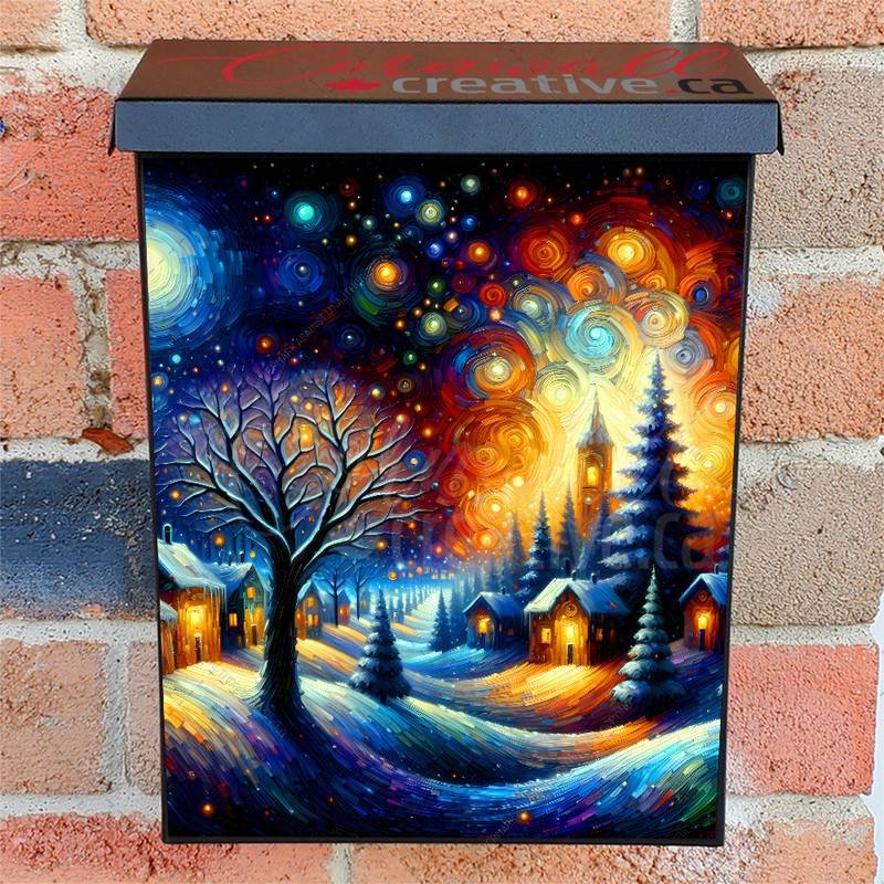 Glamorize your Mailbox and your neighborhood with this brilliant Starry Winter Night Colonial magnetic or self adhesive vinyl Mailbox Cover. Our magnetic covers feature a complete magnetic surface throughout the entire design, unlike lower-quality options that only incorporate two magnet strips combined with a piece of canvas. This ensures better functionality and a more reliable, stronger hold against the wind, also these covers have an additional UV protection, so your covers will not fade for many years. We offer self-adhesive and magnetic covers with both standard opaque vinyl or reflective vinyl options. The reflective mailbox covers function just like license plates and road signs, ensuring excellent visibility during nighttime. No matter the size of your mailbox, we make covers for all box sizes to suit your needs perfectly!