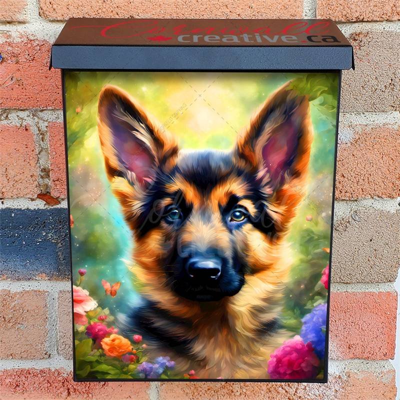 Decorate your Mailbox and your neighborhood with this brilliant Summer German Shepherd Puppy Colonial magnetic or self adhesive vinyl Mailbox Cover. Our magnetic covers feature a complete magnetic surface throughout the entire design, unlike lower-quality options that only incorporate two magnet strips combined with a piece of canvas. This ensures better functionality and a more reliable, stronger hold against the wind, also these covers have an additional UV protection, so your covers will not fade for many years. We offer self-adhesive and magnetic covers with both standard opaque vinyl or reflective vinyl options. The reflective mailbox covers function just like license plates and road signs, ensuring excellent visibility during nighttime. No matter the size of your mailbox, we make covers for all box sizes to suit your needs perfectly!