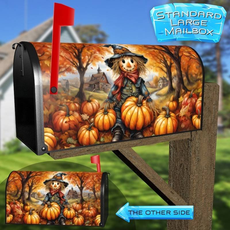 Reform your Mailbox and your neighborhood with this brilliant The Cutest Scarecrow curbside / rural / farm magnetic or self adhesive vinyl Mailbox Cover. Our magnetic covers feature a complete magnetic surface throughout the entire design, unlike lower-quality options that only incorporate two magnet strips combined with a piece of canvas. This ensures better functionality and a more reliable, stronger hold against the wind, also these covers have an additional UV protection, so your covers will not fade for many years. We offer self-adhesive and magnetic covers with both standard opaque vinyl or reflective vinyl options. The reflective mailbox covers function just like license plates and road signs, ensuring excellent visibility during nighttime. No matter the size of your mailbox, we make covers for all small, large and jumbo boxes to suit your needs perfectly!