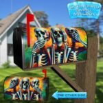 Spruce up your Mailbox and your neighborhood with this brilliant Three Wise Skeletons curbside / rural / farm magnetic or self adhesive vinyl Mailbox Cover. Our magnetic covers feature a complete magnetic surface throughout the entire design, unlike lower-quality options that only incorporate two magnet strips combined with a piece of canvas. This ensures better functionality and a more reliable, stronger hold against the wind, also these covers have an additional UV protection, so your covers will not fade for many years. We offer self-adhesive and magnetic covers with both standard opaque vinyl or reflective vinyl options. The reflective mailbox covers function just like license plates and road signs, ensuring excellent visibility during nighttime. No matter the size of your mailbox, we make covers for all small, large and jumbo boxes to suit your needs perfectly!