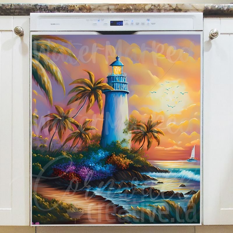 Reform your kitchen effortlessly with this stunning Tropical Lighthouse Magnetic Dishwasher Door Cover! Keep in mind that while this cover works with most dishwashers, some stainless steel and plastic doors might not hold magnets. There are two types of stainless steel: one that attracts magnets well and another that does not, and plastic doors will definitely not work with magnets. So, it is a good idea to test the surface with a magnet before making a purchase. If your dishwasher door is not compatible, consider opting for the Removable Dishwasher Door Sticker instead. Your gussied up kitchen will be ready for the season in no time! Keep in mind that this magnetic cover is versatile and can be used on a variety of appliances, including fridges, freezers, washers, dryers, and more!