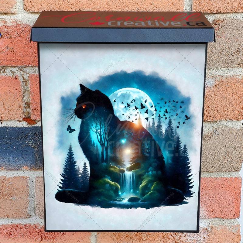 Transform your Mailbox and your neighborhood with this brilliant Twilight Forest Cat Colonial magnetic or self adhesive vinyl Mailbox Cover. Our magnetic covers feature a complete magnetic surface throughout the entire design, unlike lower-quality options that only incorporate two magnet strips combined with a piece of canvas. This ensures better functionality and a more reliable, stronger hold against the wind, also these covers have an additional UV protection, so your covers will not fade for many years. We offer self-adhesive and magnetic covers with both standard opaque vinyl or reflective vinyl options. The reflective mailbox covers function just like license plates and road signs, ensuring excellent visibility during nighttime. No matter the size of your mailbox, we make covers for all box sizes to suit your needs perfectly!