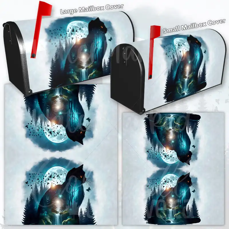 Reform your Mailbox and your neighborhood with this brilliant Twilight Forest Cat curbside / rural / farm magnetic or self adhesive vinyl Mailbox Cover. Our magnetic covers feature a complete magnetic surface throughout the entire design, unlike lower-quality options that only incorporate two magnet strips combined with a piece of canvas. This ensures better functionality and a more reliable, stronger hold against the wind, also these covers have an additional UV protection, so your covers will not fade for many years. We offer self-adhesive and magnetic covers with both standard opaque vinyl or reflective vinyl options. The reflective mailbox covers function just like license plates and road signs, ensuring excellent visibility during nighttime. No matter the size of your mailbox, we make covers for all small, large and jumbo boxes to suit your needs perfectly!