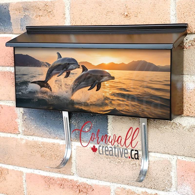 Applying your Two Beautiful Dolphin Leaping Jumping From Shining Sunset Sea wall-mounted townhouse / ranch mailbox cover it is pretty easy to lift your mailbox to a special and unique item. These covers require a flat surface, so they work with townhouse / ranch mailboxes that do not have any embossed / debossed decoration or signs. Magnetic mailbox covers work with steel boxes only, for aluminum and plastic boxes we offer the self-adhesive vinyl covers. Also, you can create your custom townhouse / ranch mailbox cover using you own pictures, adding your name, street number, etc. Our magnetic covers feature a complete magnetic surface throughout the entire design, unlike lower-quality options that only incorporate two magnet strips combined with a piece of canvas. This ensures better functionality and a more reliable, stronger hold against the wind, also these covers have an additional UV protection, so your covers will not fade for many years. The reflective mailbox covers function just like license plates and road signs, ensuring excellent visibility during nighttime.