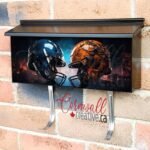 Applying your Two Football Helmets In Front Of City Background wall-mounted townhouse / ranch mailbox cover it is pretty easy to gussy up your mailbox to a special and unique item. These covers require a flat surface, so they work with townhouse / ranch mailboxes that do not have any embossed / debossed decoration or signs. Magnetic mailbox covers work with steel boxes only, for aluminum and plastic boxes we offer the self-adhesive vinyl covers. Also, you can create your custom townhouse / ranch mailbox cover using you own pictures, adding your name, street number, etc. Our magnetic covers feature a complete magnetic surface throughout the entire design, unlike lower-quality options that only incorporate two magnet strips combined with a piece of canvas. This ensures better functionality and a more reliable, stronger hold against the wind, also these covers have an additional UV protection, so your covers will not fade for many years. The reflective mailbox covers function just like license plates and road signs, ensuring excellent visibility during nighttime.