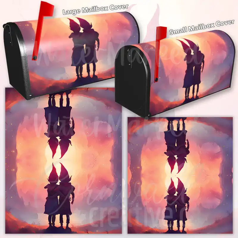 Lift your Mailbox and your neighborhood with this brilliant Valentine’s Gnome Couple curbside / rural / farm magnetic or self adhesive vinyl Mailbox Cover. Our magnetic covers feature a complete magnetic surface throughout the entire design, unlike lower-quality options that only incorporate two magnet strips combined with a piece of canvas. This ensures better functionality and a more reliable, stronger hold against the wind, also these covers have an additional UV protection, so your covers will not fade for many years. We offer self-adhesive and magnetic covers with both standard opaque vinyl or reflective vinyl options. The reflective mailbox covers function just like license plates and road signs, ensuring excellent visibility during nighttime. No matter the size of your mailbox, we make covers for all small, large and jumbo boxes to suit your needs perfectly!