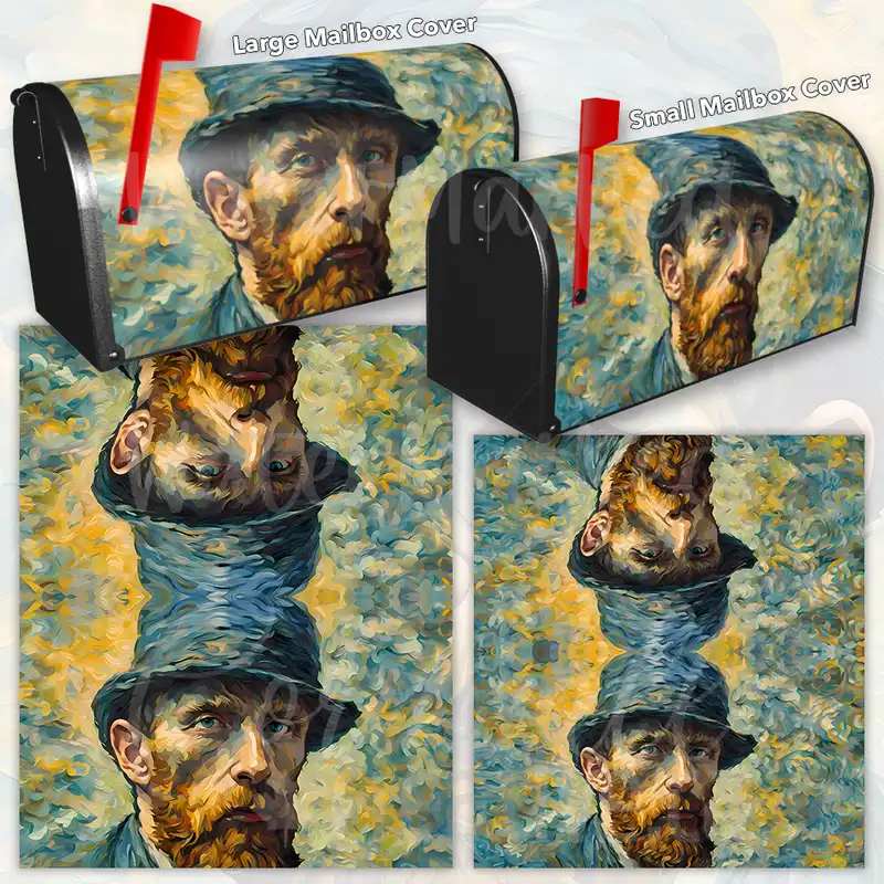 Adorn your Mailbox and your neighborhood with this brilliant Van Gogh Portrait curbside / rural / farm magnetic or self adhesive vinyl Mailbox Cover. Our magnetic covers feature a complete magnetic surface throughout the entire design, unlike lower-quality options that only incorporate two magnet strips combined with a piece of canvas. This ensures better functionality and a more reliable, stronger hold against the wind, also these covers have an additional UV protection, so your covers will not fade for many years. We offer self-adhesive and magnetic covers with both standard opaque vinyl or reflective vinyl options. The reflective mailbox covers function just like license plates and road signs, ensuring excellent visibility during nighttime. No matter the size of your mailbox, we make covers for all small, large and jumbo boxes to suit your needs perfectly!