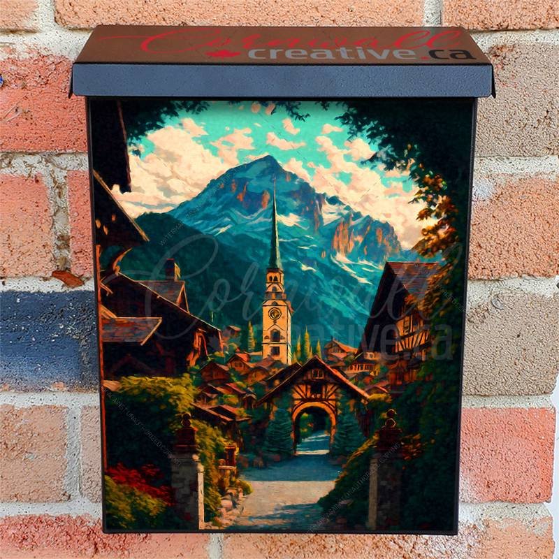 Glamorize your Mailbox and your neighborhood with this brilliant Village in the Swiss Alps Colonial magnetic or self adhesive vinyl Mailbox Cover. Our magnetic covers feature a complete magnetic surface throughout the entire design, unlike lower-quality options that only incorporate two magnet strips combined with a piece of canvas. This ensures better functionality and a more reliable, stronger hold against the wind, also these covers have an additional UV protection, so your covers will not fade for many years. We offer self-adhesive and magnetic covers with both standard opaque vinyl or reflective vinyl options. The reflective mailbox covers function just like license plates and road signs, ensuring excellent visibility during nighttime. No matter the size of your mailbox, we make covers for all box sizes to suit your needs perfectly!