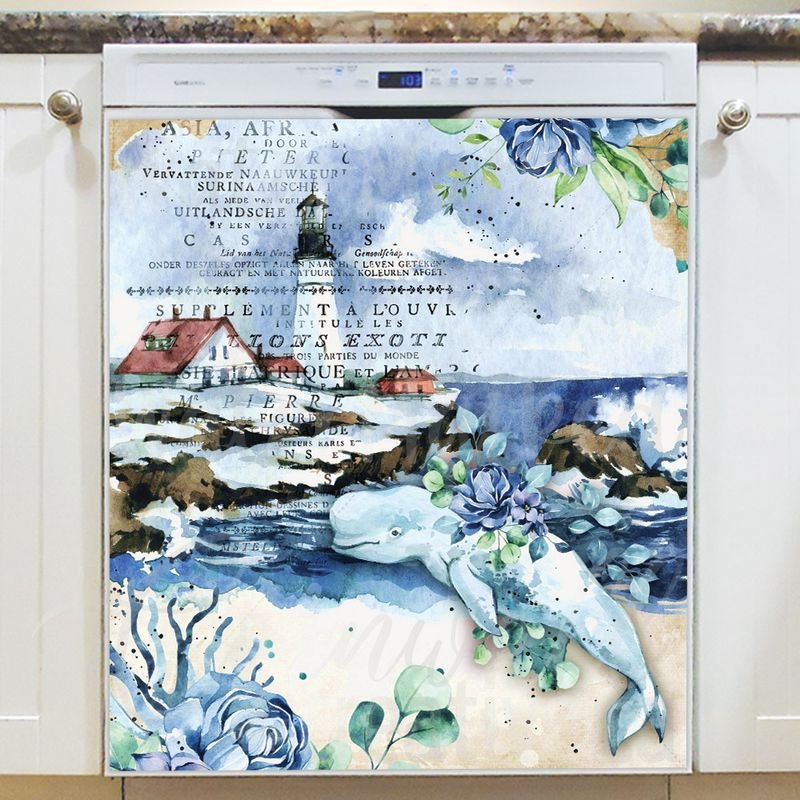 Vintage Lighthouse, Whale and Flowers Magnetic Dishwasher Door Cover