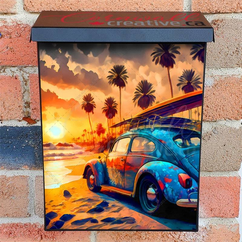 Spruce up your Mailbox and your neighborhood with this brilliant Volkswagen Beetle on the Beach Colonial magnetic or self adhesive vinyl Mailbox Cover. Our magnetic covers feature a complete magnetic surface throughout the entire design, unlike lower-quality options that only incorporate two magnet strips combined with a piece of canvas. This ensures better functionality and a more reliable, stronger hold against the wind, also these covers have an additional UV protection, so your covers will not fade for many years. We offer self-adhesive and magnetic covers with both standard opaque vinyl or reflective vinyl options. The reflective mailbox covers function just like license plates and road signs, ensuring excellent visibility during nighttime. No matter the size of your mailbox, we make covers for all box sizes to suit your needs perfectly!