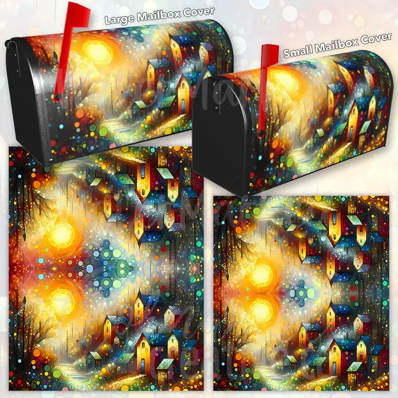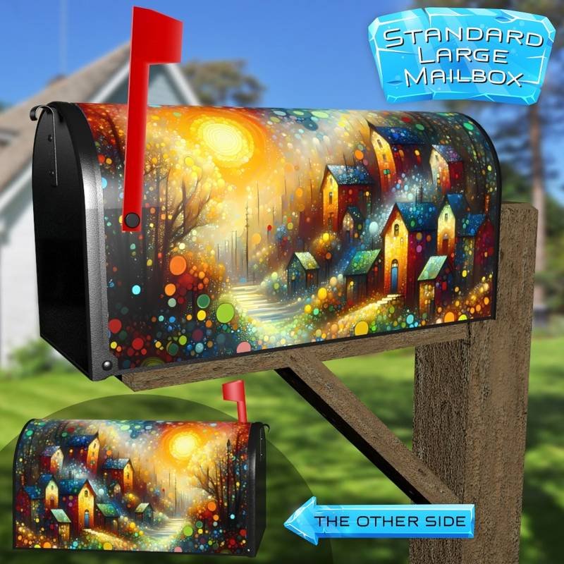 Develop your Mailbox and your neighborhood with this brilliant Warm Summer Morning in the Village curbside / rural / farm magnetic or self adhesive vinyl Mailbox Cover. Our magnetic covers feature a complete magnetic surface throughout the entire design, unlike lower-quality options that only incorporate two magnet strips combined with a piece of canvas. This ensures better functionality and a more reliable, stronger hold against the wind, also these covers have an additional UV protection, so your covers will not fade for many years. We offer self-adhesive and magnetic covers with both standard opaque vinyl or reflective vinyl options. The reflective mailbox covers function just like license plates and road signs, ensuring excellent visibility during nighttime. No matter the size of your mailbox, we make covers for all small, large and jumbo boxes to suit your needs perfectly!