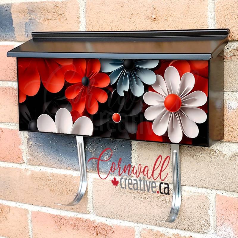 Applying your White Red and Black Flowers wall-mounted townhouse / ranch mailbox cover it is pretty easy to spruce up your mailbox to a special and unique item. These covers require a flat surface, so they work with townhouse / ranch mailboxes that do not have any embossed / debossed decoration or signs. Magnetic mailbox covers work with steel boxes only, for aluminum and plastic boxes we offer the self-adhesive vinyl covers. Also, you can create your custom townhouse / ranch mailbox cover using you own pictures, adding your name, street number, etc. Our magnetic covers feature a complete magnetic surface throughout the entire design, unlike lower-quality options that only incorporate two magnet strips combined with a piece of canvas. This ensures better functionality and a more reliable, stronger hold against the wind, also these covers have an additional UV protection, so your covers will not fade for many years. The reflective mailbox covers function just like license plates and road signs, ensuring excellent visibility during nighttime.