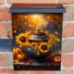 Revamp your Mailbox and your neighborhood with this brilliant Witch Cauldron and Sunflowers Colonial magnetic or self adhesive vinyl Mailbox Cover. Our magnetic covers feature a complete magnetic surface throughout the entire design, unlike lower-quality options that only incorporate two magnet strips combined with a piece of canvas. This ensures better functionality and a more reliable, stronger hold against the wind, also these covers have an additional UV protection, so your covers will not fade for many years. We offer self-adhesive and magnetic covers with both standard opaque vinyl or reflective vinyl options. The reflective mailbox covers function just like license plates and road signs, ensuring excellent visibility during nighttime. No matter the size of your mailbox, we make covers for all box sizes to suit your needs perfectly!